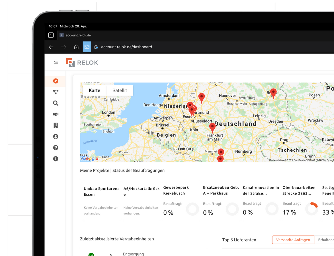 Integrieren und automatisieren Sie den gesamten Beschaffungsprozess - von der Lieferantensuche über den Vergleich von Angeboten bis hin zur Auftragsvergabe. Mit Relok haben Sie alle alle Beschaffungsaktivitäten immer im Blick.